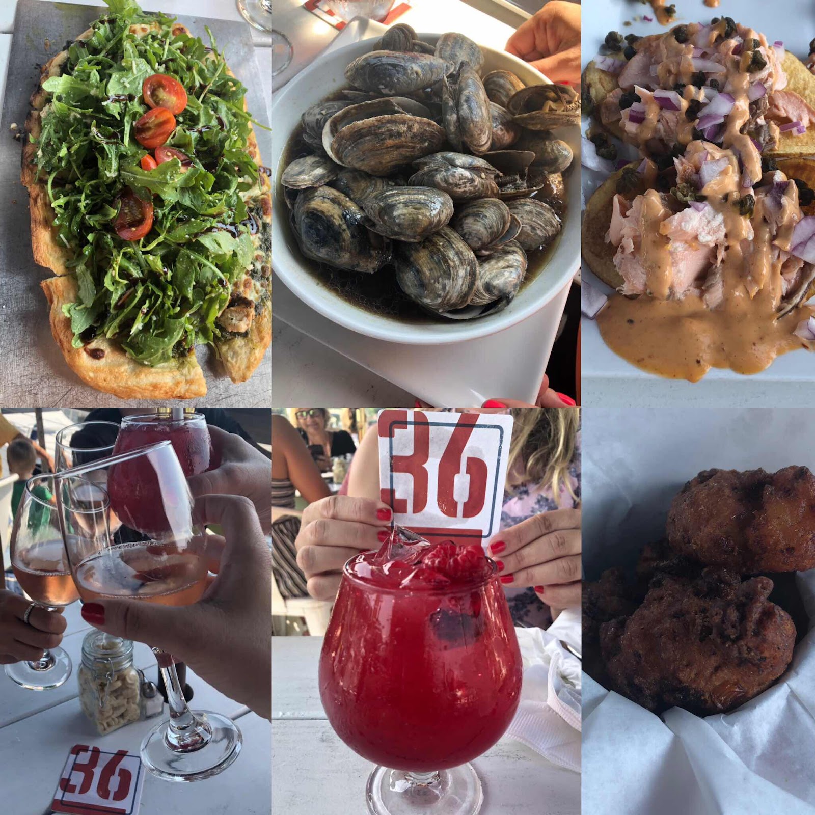 My girlfriend was craving steamers. She lucked out when she saw them on the menu. Followed by her berry hibiscus drink with Tito’s. Was a great lunch. I ordered their arugula chicken and pesto flatbread. Was perfect after a weekend of eating bad in the Cape. The salmon chips are always a hit and this time we tried their clam and corn fritters.
