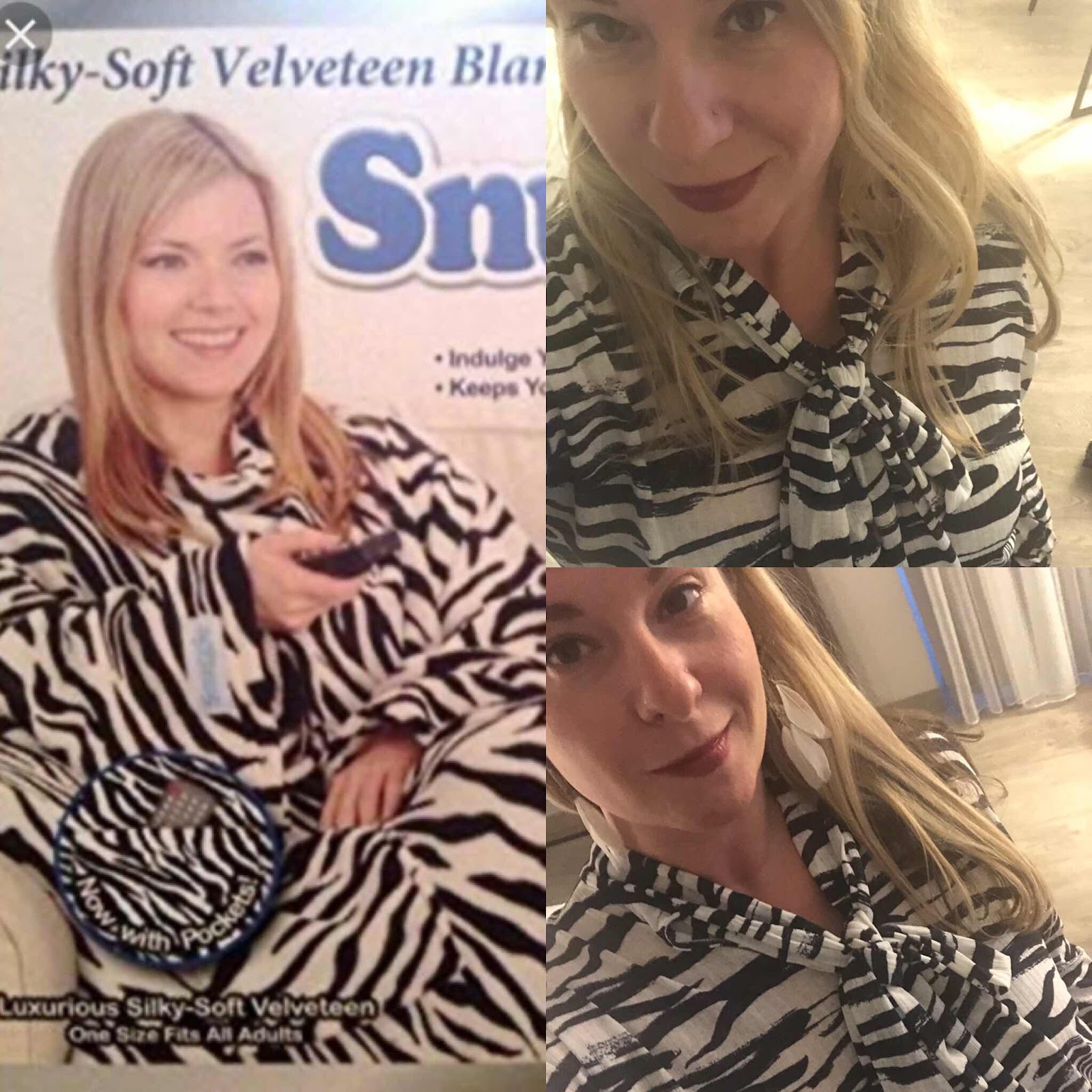 I am getting ready for a really big work dinner that I coordinated. At an awesome steakhouse. I take a picture of my outfit and send to him and he responds you look like a zebra Snuggie and sends me the picture.