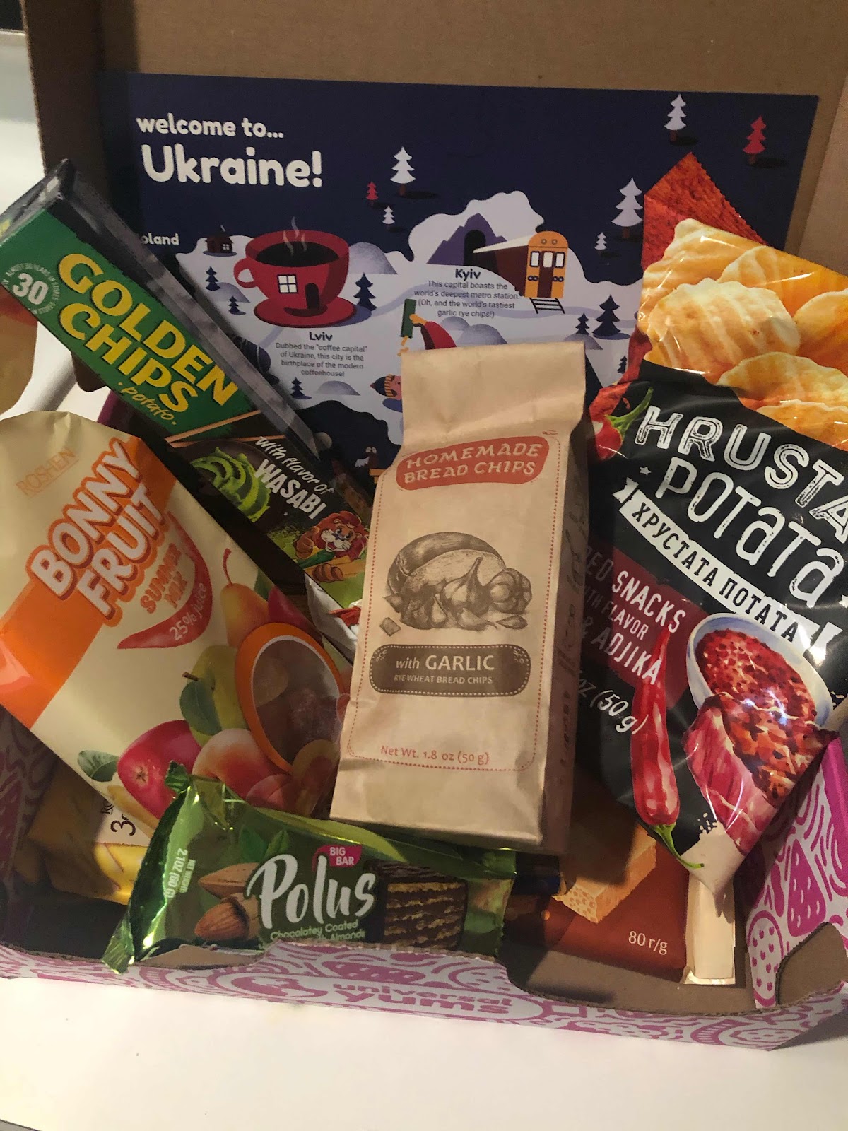 We love when our yums box comes in. This month was from Ukraine. What a variety of fun stuff we received.