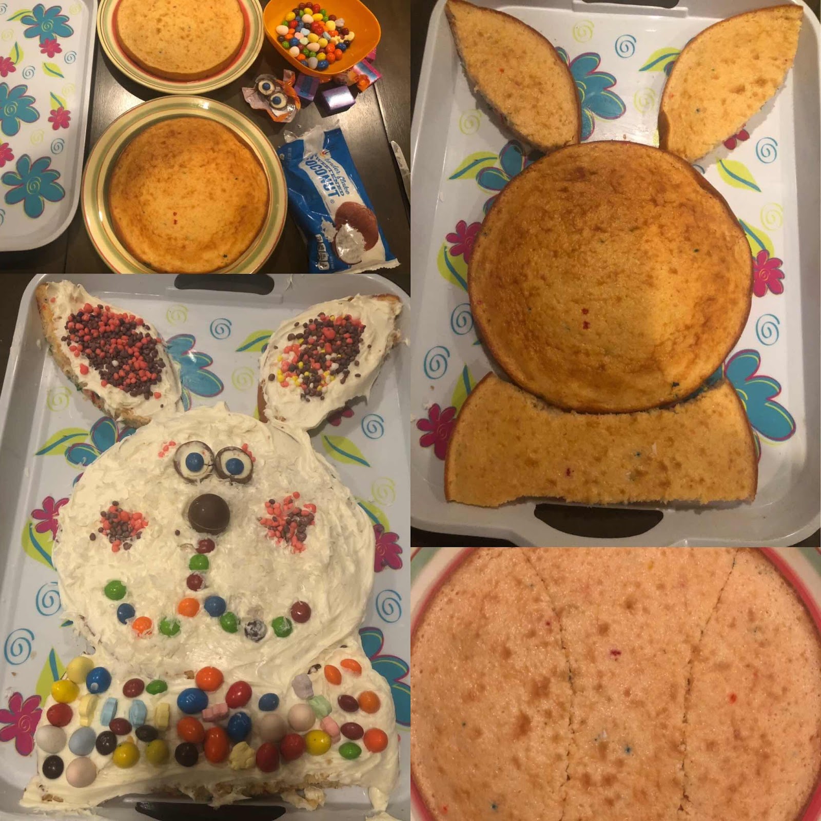 It’s so easy. Just make two round cakes. Cut out the two ears and a bow is in the middle. Assemble and decorate. I usually use shredded coconut to look like fur.